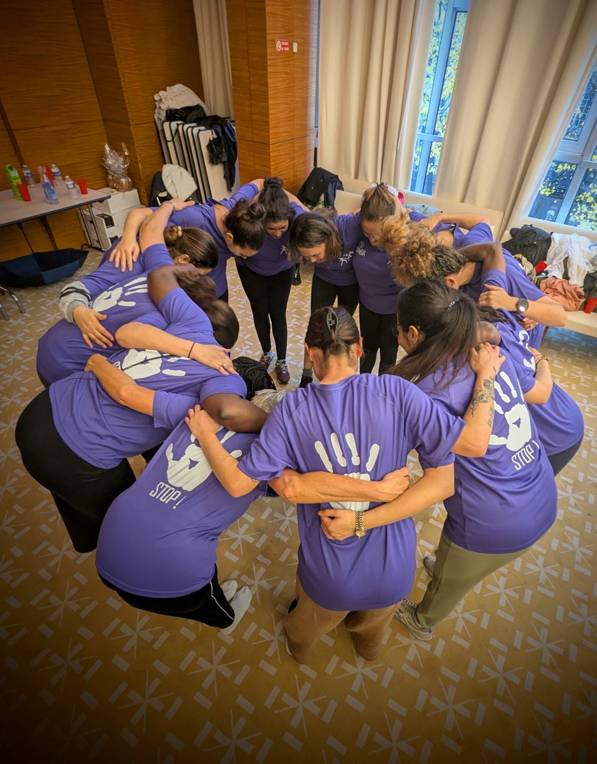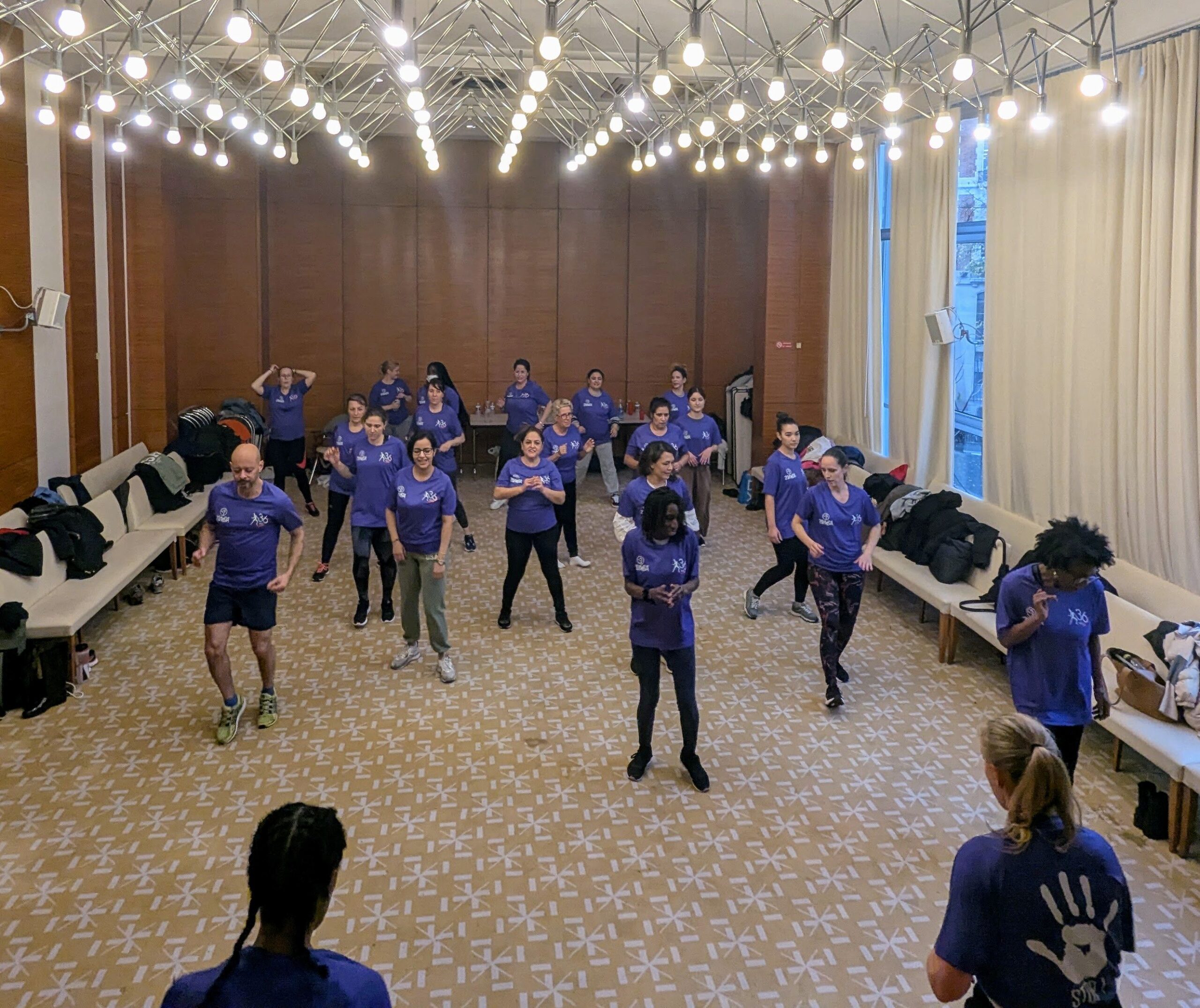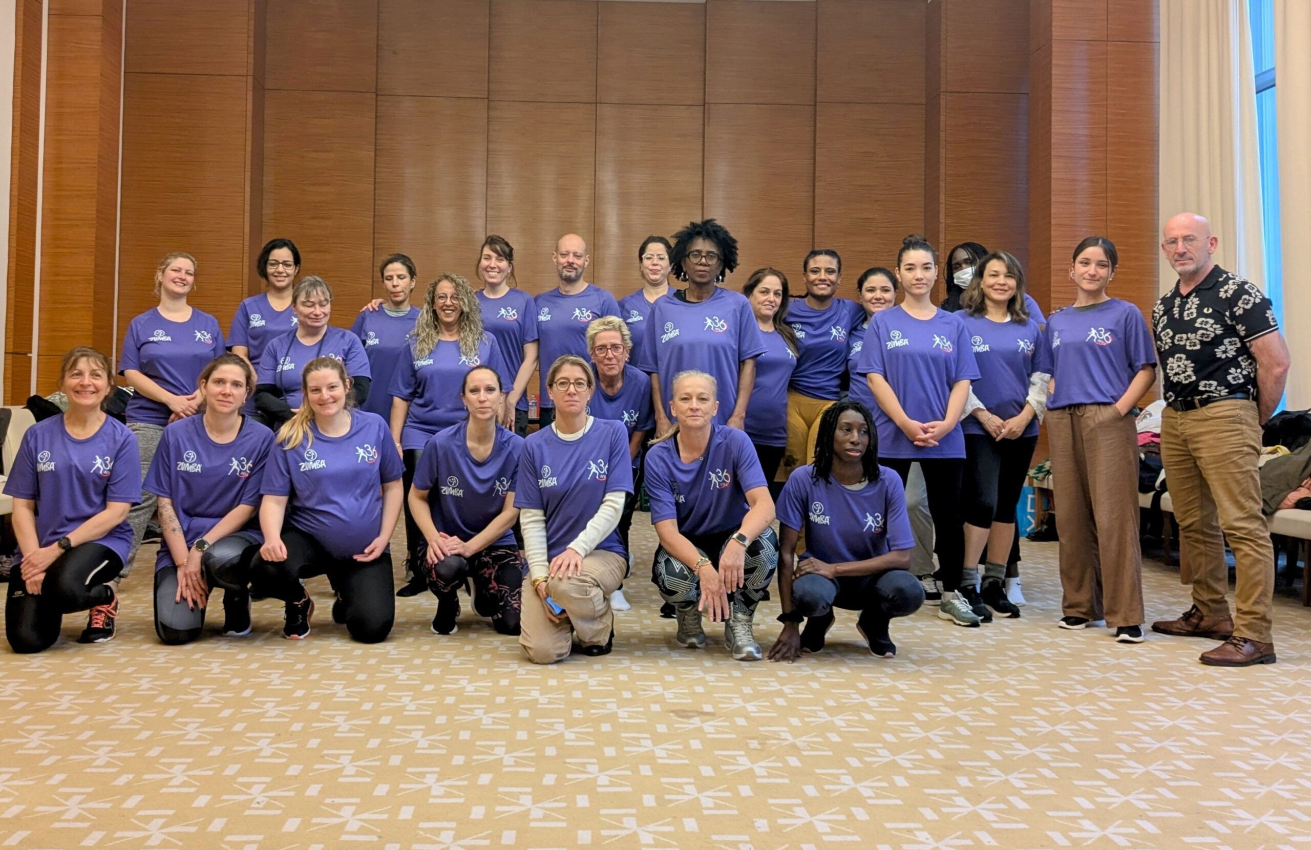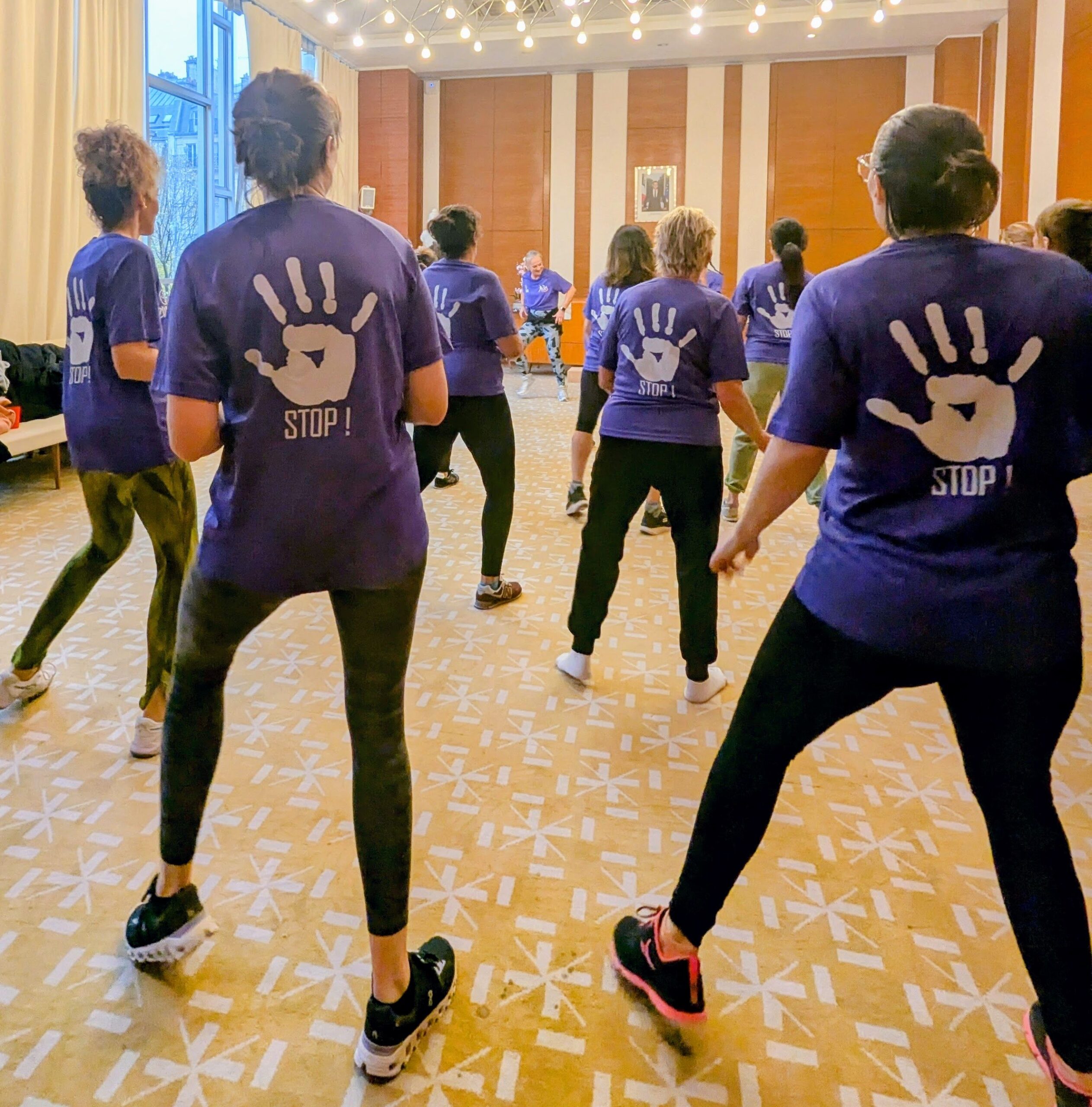 A l’initiative de Olympe U. du bureau de l’AFPJ et danseuse hors pair assistée de Lydie C., coach diplômée de Zumba, deux associations de soutien aux violences faites aux femmes – ELLE’S IMAGINE’NT & LIBRES TERRES DES FEMMES – ont accepté l’invitation des policières du Bastion et sont venues danser deux heures à des rythmes endiablés sur l’événement solidaire ZUMBA Solid’elles, parées de leur tee-shirt spécialement créé par l’AFPJ, dans la grande salle des mariages, mise à disposition pour l’occasion par la Mairie du 17e.