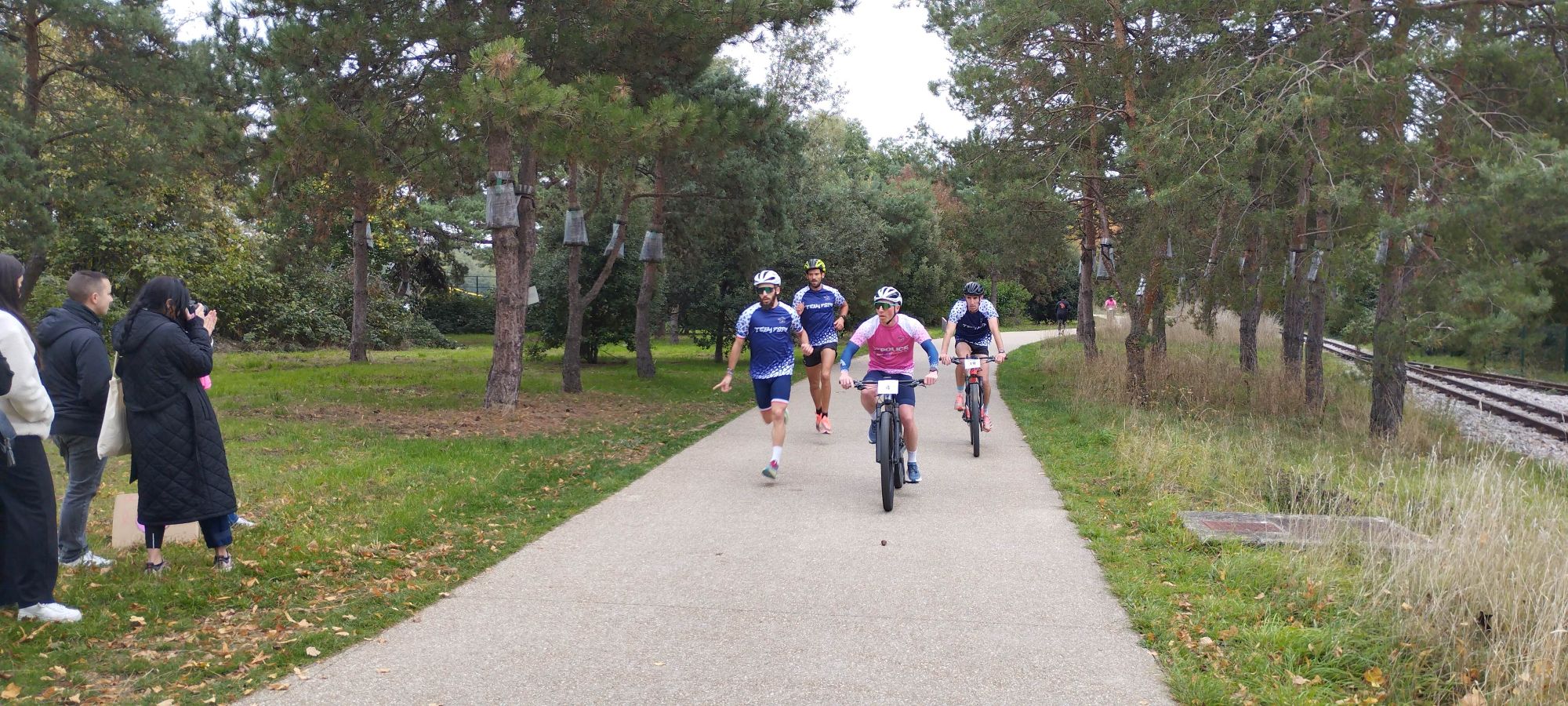 A cet effet, la Ligue Ile de France FSPN a remis un maillot Team police rose ou bleu à chaque engagé avant de lancer le départ de cette course comprenant 5 tours d’environ 2.4 kms à réaliser en binôme, l’un sur le vélo et l’autre en courant. Les membres de chaque équipe pouvaient échanger leurs rôles à tout moment de la course.