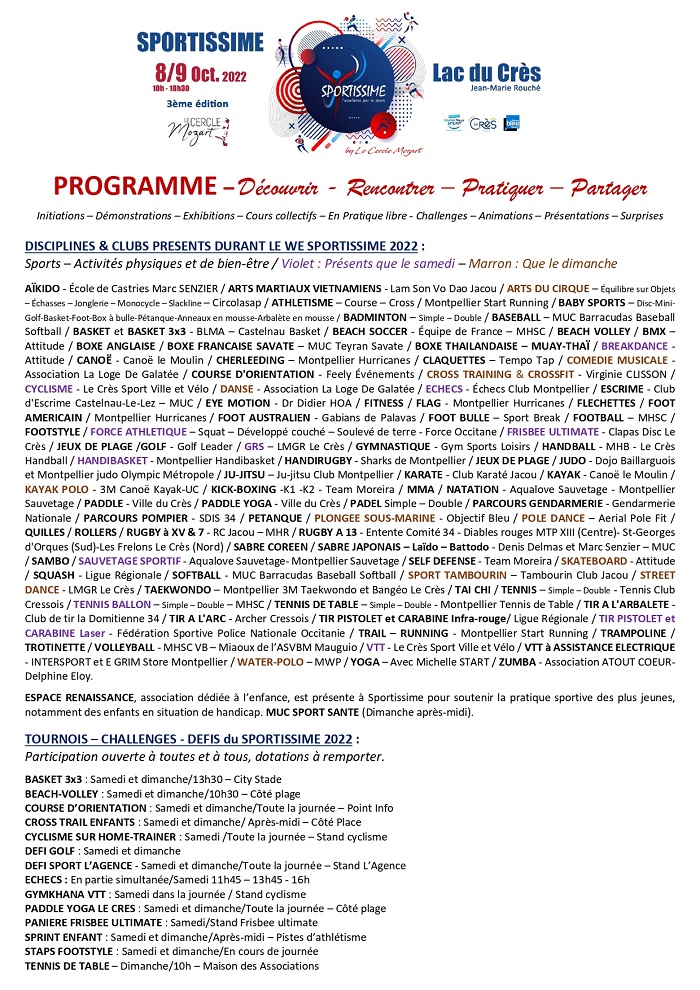 L’objectif de SPORTISSIME, consacré à l’excellence et aux bienfaits de la pratique sportive, est de permettre à toutes et à tous, quel que soit leurs âges, de pouvoir découvrir, s’initier à et pratiquer plus de 90 disciplines sportives, individuelles et collectives, terrestres et nautiques, avec les clubs professionnels, élites, amateurs, handisports du « Grand Montpellier », et leurs champions. Cette 3ème édition de SPORTISSIME, labellisé « Sentez-Vous Sport » par le CNOSF, a mis particulièrement à l’honneur le mouvement olympique et sportif et ses valeurs. L’évènement est organisé par le Cercle Mozart et plus précisément par sa commission sportive avec comme président Laurent PIONNER, l’ancien portier du MHSC football.