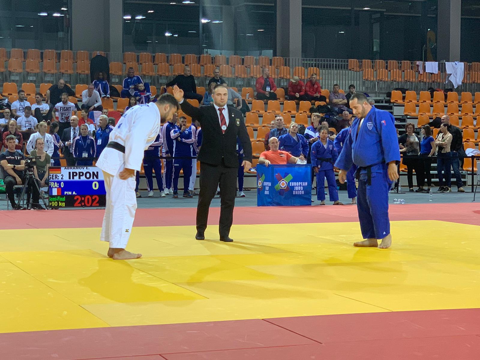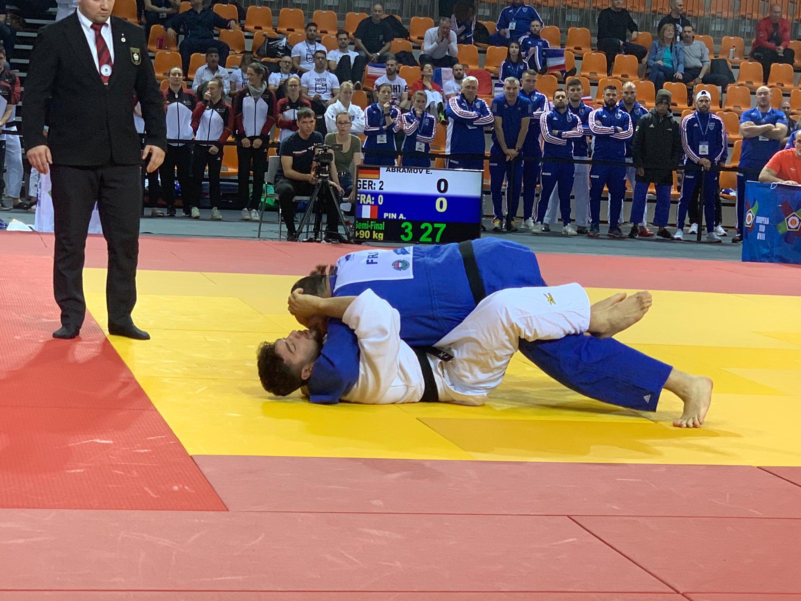 Adrien se présente à son tour sur le tapis. « Pinpin » souhaite réduire le score et donne tout face à Érik ABRAMOV médaillé de bronze en +100Kg la veille.