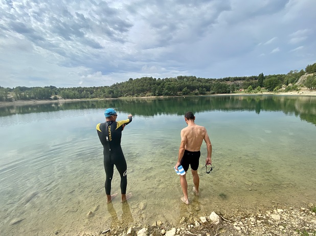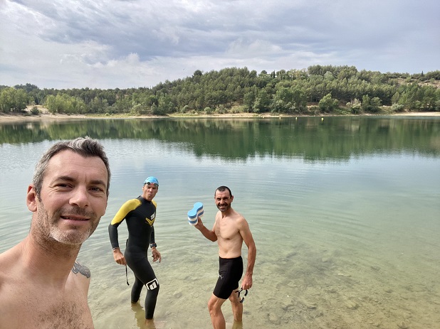 Au programme de la 1ère journée, une belle natation dans les eaux turquoises du lac du Crès. Séance écourtée au bout de 1500m, l’orage grondant aux environs.