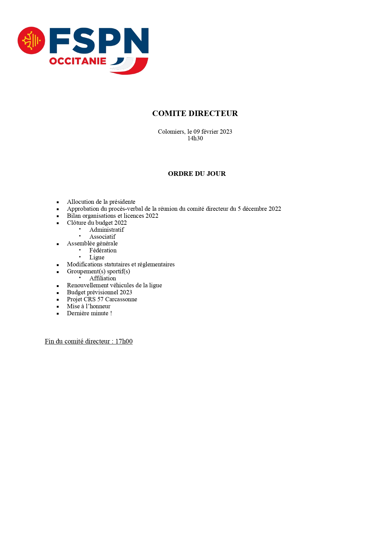 REUNION DU COMITE DIRECTEUR DE LA LIGUE OCCITANIE FSPN