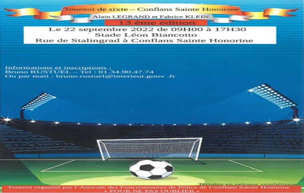 L’Amicale des fonctionnaires de Police de Conflans Sainte Honorine (78) organise la 13ème édition du TOURNOI DE SIXTE Alain LEGRAND et Fabrice KLEIN.